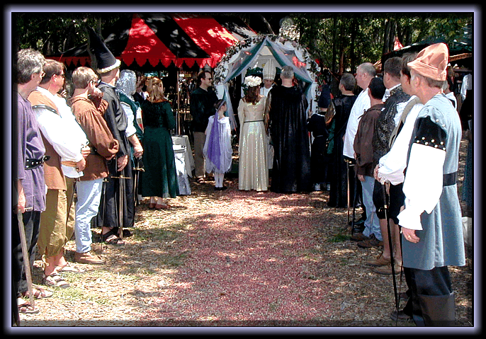 In celebration of this most joyous occasion on this 6th day of April in the year of our lord, 2002 we will witness the union of Lord Paul Styrcula and Lady Cas Sambets in keeping with the traditions of our beloved King Henry II and Queen Elizabeth we shall close the boundaries and seal out evil. This will be done by those that witness today to gather ye round to insulate Lord Paul and Lady Cas. This will be done by our deeds here today to gather round and also by our might in the circle of the swords signified by the Knights of the Round Table from that stems the serenity of thine great kingdom and that which reeks havoc and ruin to thine enemies. Honor and glory be.... Bestowed upon thee this day in this joyous occasion. These families we will unite and for those that might be heard ...planting the seeds of greatness.